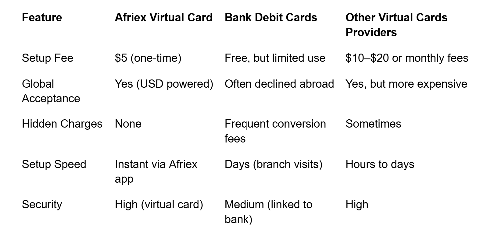 Unlike other providers that charge monthly fees, Afriex charges a single one-time $5 fee to set up your virtual card. After that, you’re good to go.